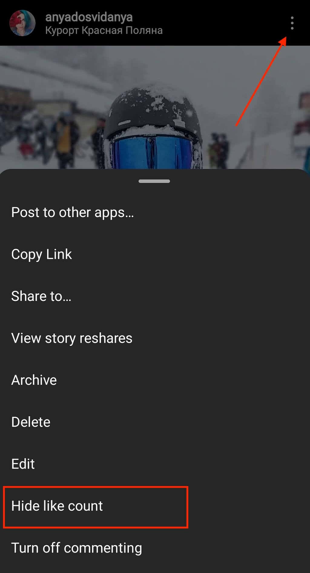 - On top of the page, toggle the Hide like and view counts on this post switch on. If you don’t see this option, it’s possible that your Instagram app is outdated. Try restarting the app, and if you still don’t see the option to hide likes, update Instagram and restart the app one more time.