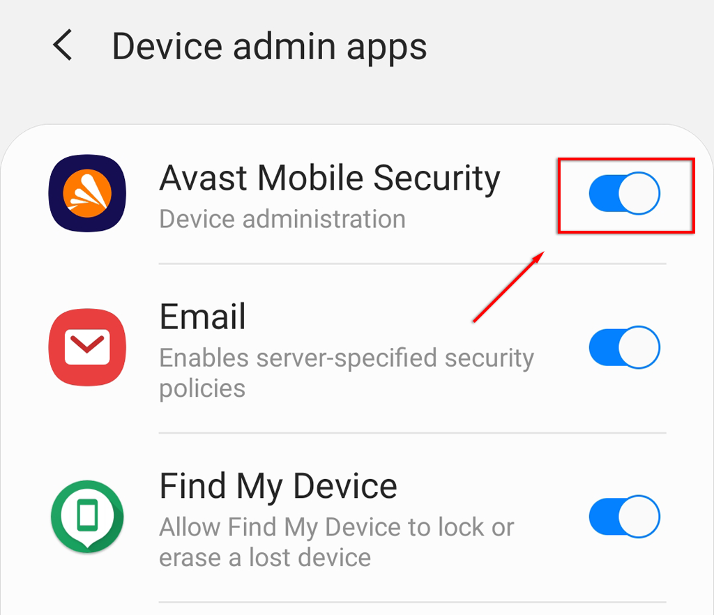 1. Find the app you want to remove and tap the slider to revoke administrator privileges. You may have to tap the app and select Deactivate on some models.