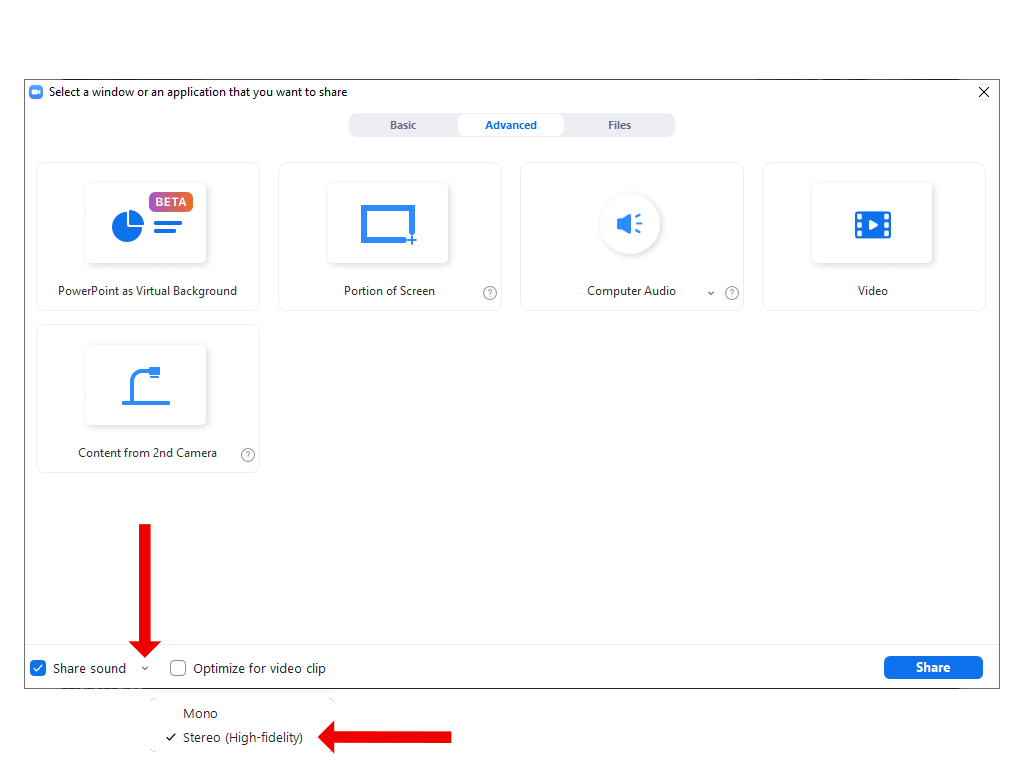 When you hit the Share button to begin screen sharing, meeting participants can enjoy listening to music or other audio in stereo quality.