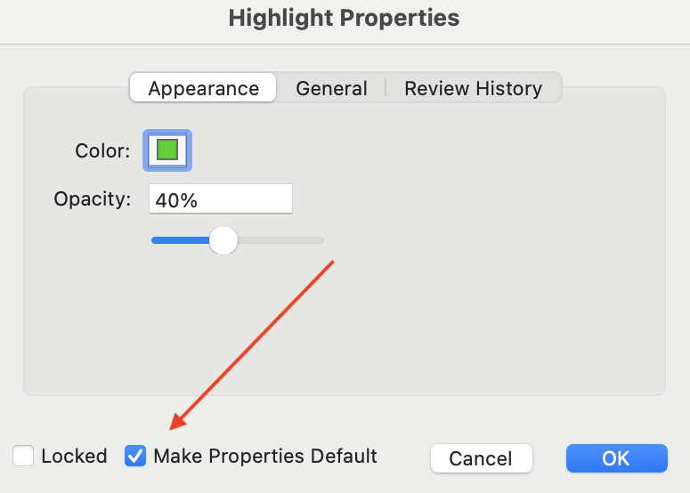 To make the new color the default color for all future edits, check the box labeled Make Properties default in the Highlight Properties window. This ensures that your chosen color becomes the default highlight color for future use.