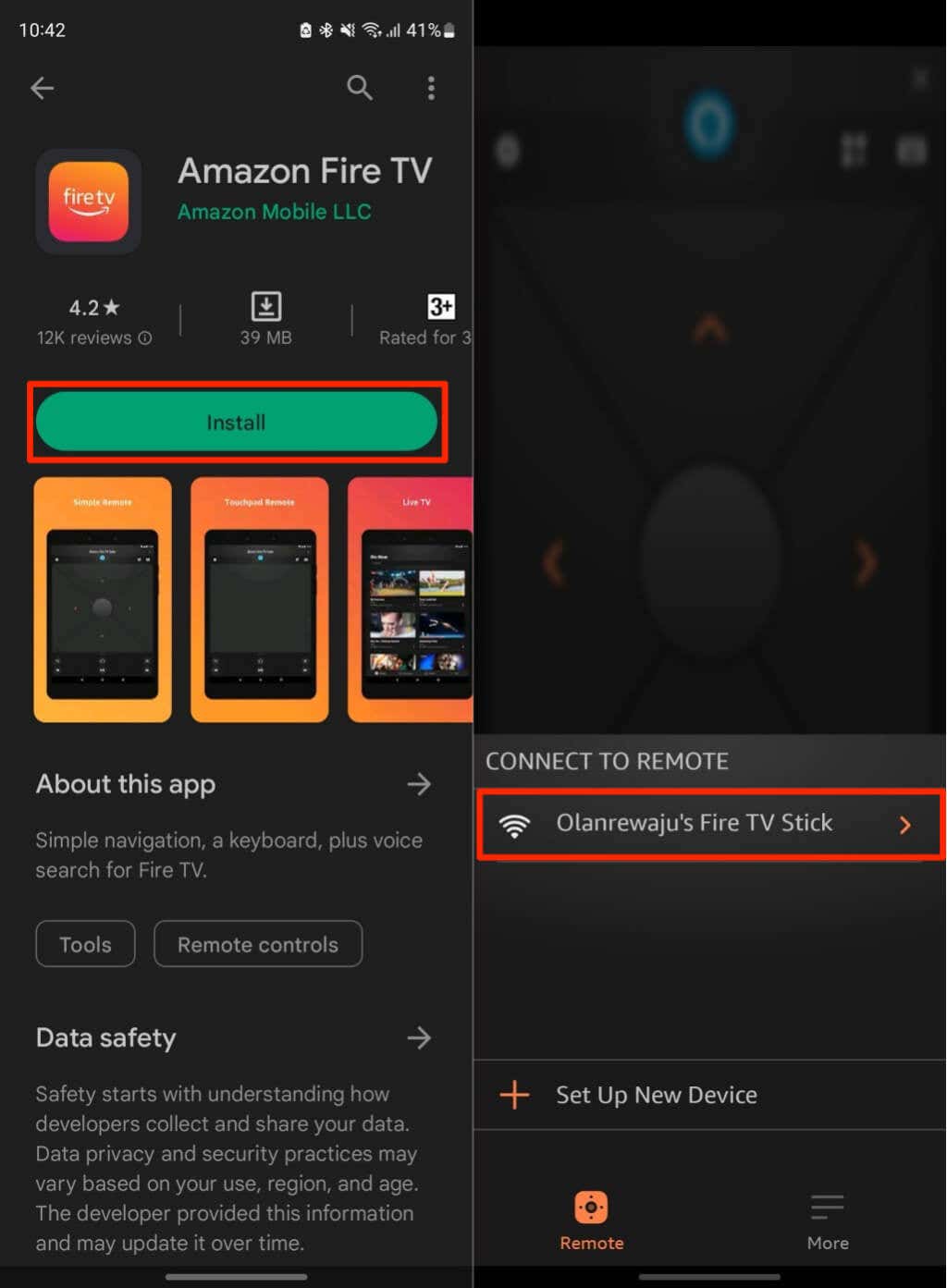 3. Open the Amazon Fire TV app and wait for it to detect your Fire TV device. Select your device in the “Connect to Remote” section to proceed.