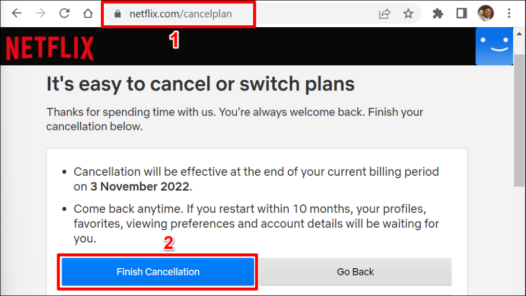 Quick Tip: A faster way to cancel your membership is to visit netflix.com/cancelplan in your web browser. Sign in to your Netflix account if prompted and select Finish Cancellation.