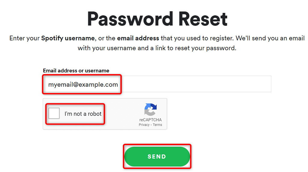 3. Select the Email address or username field and type your Spotify email address or username. Then, confirm the captcha and select Send.