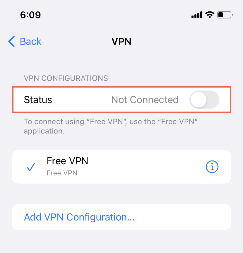Go to Settings > General > VPN & Device Management (iOS) or Settings > Network & internet > VPN (Android) and disable any VPN configurations on your mobile device