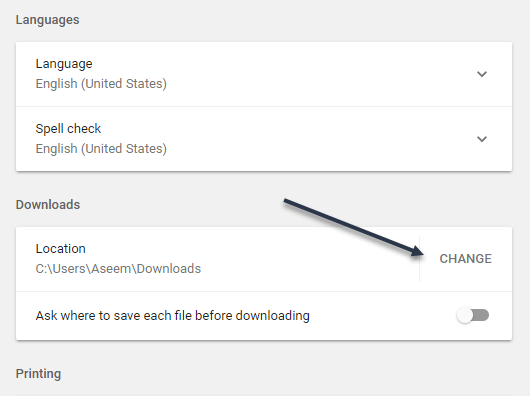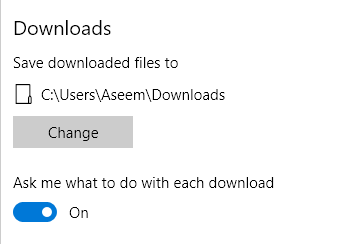 Again, scroll down until you see the Downloads heading. Go ahead and click on the Change button and pick a new location. If you need different downloads saved into different locations, then make sure to toggle the Ask where to save each file before downloading option.