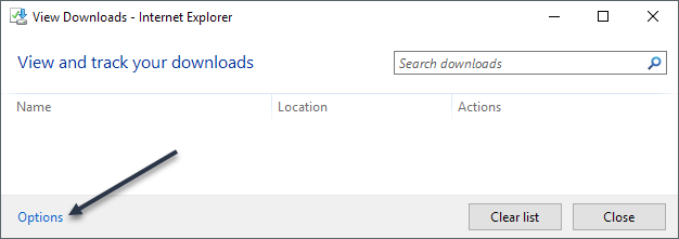 A popup window will appear that lists any current or previous downloads using IE. Click on the Options link at the bottom left.