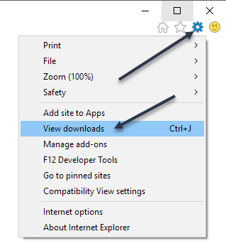 If you’re still using IE, you need to click on the gear icon and then click on View Downloads.
