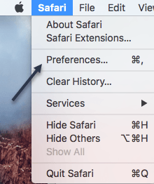 Changing this setting in Safari is pretty straight-forward. Click on Safari in the menu bar at the top and then click on Preferences.